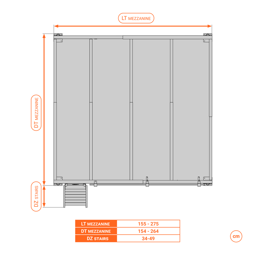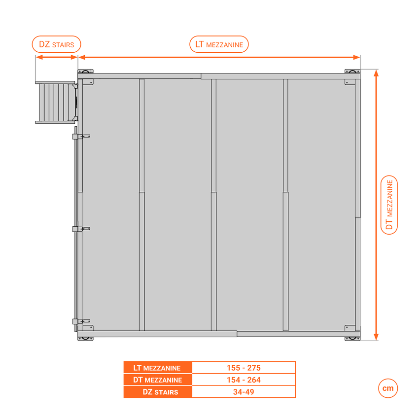 Für die Erweiterung eines Gewerberaums, den Einbau eines Balkons in Ihrem Garten oder die Schaffung eines ersten Stockwerks in Ihrer Lagerhalle oder Großgarage empfehlen wir die Zwischengeschosse der Produktreihe L. Von 209 cm bis 343 cm Höhe.