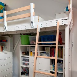Enthält ein TS 8 Stahlpodest in Weiß, eine Holzleiter mit versetzbarer Befestigung und ein Hochbettgeländer. Sparen Sie, indem Sie alles in einem Komplettpaket kaufen.
