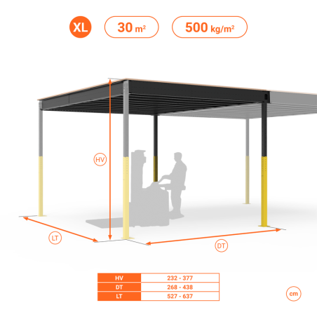 Los altillos de la Gama XL son los indicados para proyectos grandes. Por ejemplo, podrás equipar un local industrial o aumentar la productividad y capacidad de almacenaje de tu empresa. La altura de estas entreplantas va desde 235cm hasta 380cm.