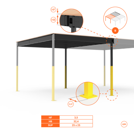 La ampliación "B" de la estructura incluye dos pilares dobles adaptables en altura, cuyo capitel permite soportar vigas primarias por ambos lados. Los dos pilares dobles reemplazan a los simples del módulo inicial, los cuales son recolocados al final del módulo de extensión. Dispone de las mismas vigas ajustables en longitud. También se incluye el piso portante de tableros estructurales para cubrir la nueva superficie.