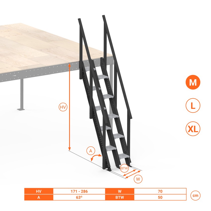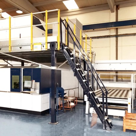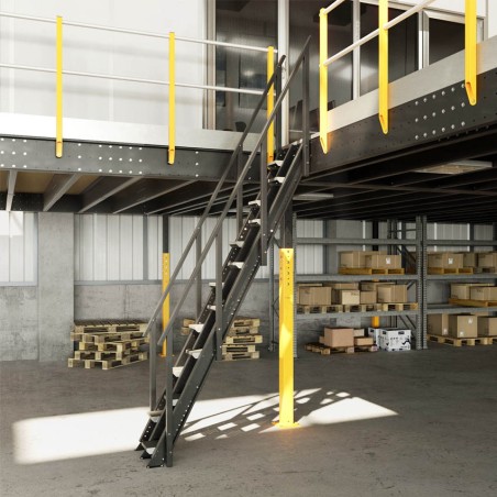 La Escalera Industrial de peldaño compensado 63º, fabricada en acero, está pensada para optimizar espacios reducidos y aprovechar la superficie disponible.