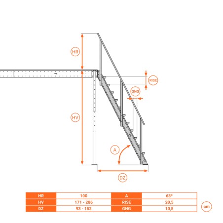 La ventaja de la Escalera Industrial de peldaño compensado 63º es que, gracias al diseño de los escalones, se reduce al mínimo el retranqueo de la escalera. Esto es posible por la configuración de sus peldaños alternos que se encuentran separados por una zanca intermedia, lo que permite apoyar completamente el pie y alcanzar un grado de inclinación mayor. De este modo podemos aprovechar al máximo el espacio, garantizando una solución adecuada para cada situación.