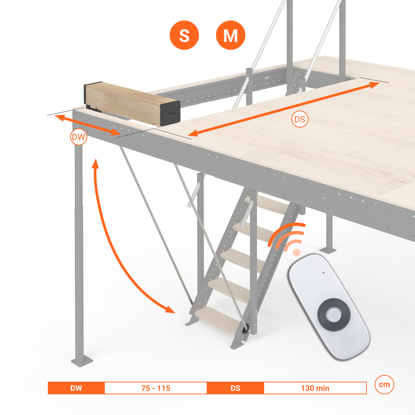 Con el Kit eléctrico de Elevación podrás levantar tu escalera con total seguridad y ocultarla a la altura de la entreplanta, aumentando la superficie útil de tu estancia inferior de forma rápida, cómoda y de forma discreta.