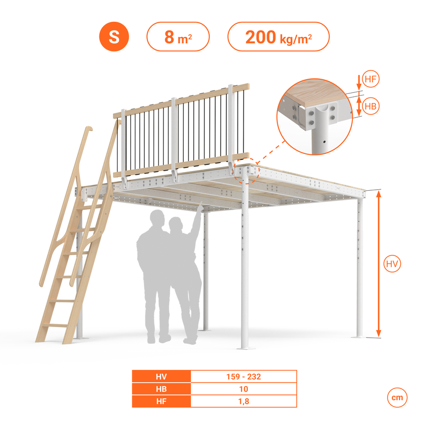 Para ampliar un espacio comercial, instalar un balcón en tu jardín o crear una segunda planta en tu almacén o garaje de grandes dimensiones, recomendamos los altillos de la Gama L. Desde 209cm hasta 343cm de altura.
