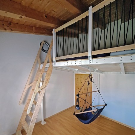 El Pack TS8 ofrece una solución práctica para crear una entreplanta en tu hogar. Esta entreplanta maximiza el espacio y te permite hacer una habitación infantil, un área de estudio o una biblioteca. La barandilla de cuerda te deja personalizar el diseño a tu gusto, mientras que la escalera de madera aporta un toque cálido y natural. Este pack es ideal para aprovechar cada rincón de tu casa y transformar tu hogar en un lugar más funcional y acogedor.