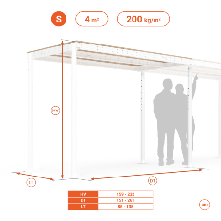 Pour agrandir un espace commercial, installer une terrasse dans votre jardin ou créer un premier étage dans votre entrepôt ou votre grand garage, nous vous recommandons les mezzanines de la gamme L, de 209 cm à 343 cm de hauteur.
