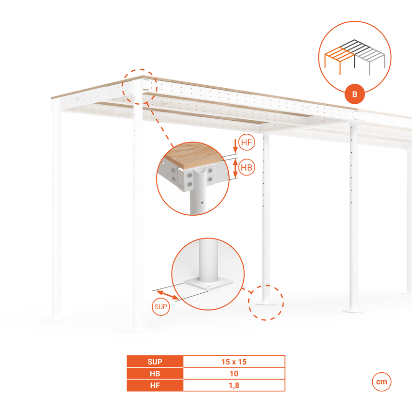 L'agrandissement "B" de la structure comprend deux piliers doubles adaptables en hauteur, dont le chapiteau supporte des poutres primaires des deux côtés. Les deux piliers doubles remplacent les piliers simples du module initial, qui sont repositionnés à la fin du module de prolongement. Il possède les mêmes poutres réglables en longueur. Il compte aussi avec le plancher portant de planches structurelles pour couvrir la nouvelle surface.